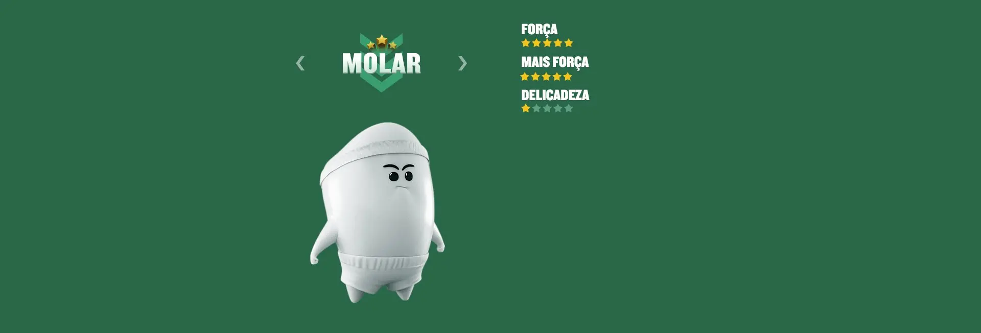 Dentão. Dentaço. Dentãozaço. Molar é forte e inabalável. Faz de tudo para não precisar entrar numa briga. Mas quando entra... Sai de baixo, viu? Ou de cima, dependendo da posição que ele estiver. Apesar de sua incrível força natural, ele ainda apela: toma fartos banhos diários de LISTERINE® para se remineralizar e ficar com o esmalte sempre forte. Quer dizer, ainda mais forte. Covardia? Talvez. Mas a cárie merece.